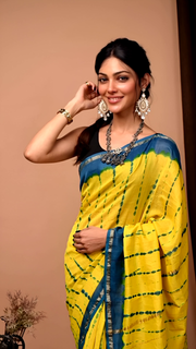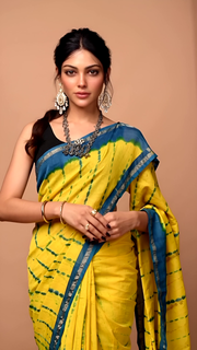Add a splash of freshness to your collection with this yellow cotton saree featuring blue tie-dye accents and a contrasting border. Its lightweight fabric and vibrant color combination make it an excellent choice for casual outings, festive occasions, and day functions.