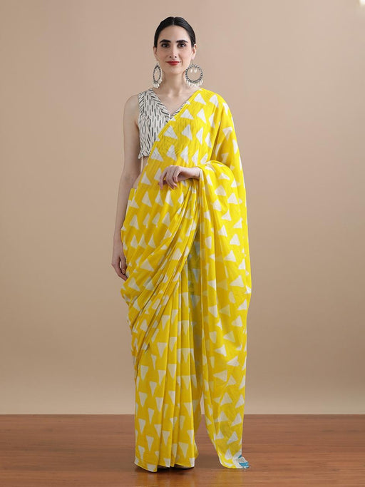 View full detailsAdd a burst of sunshine to your wardrobe with this yellow cotton saree featuring playful white geometric prints. Lightweight and breezy, it’s perfe...