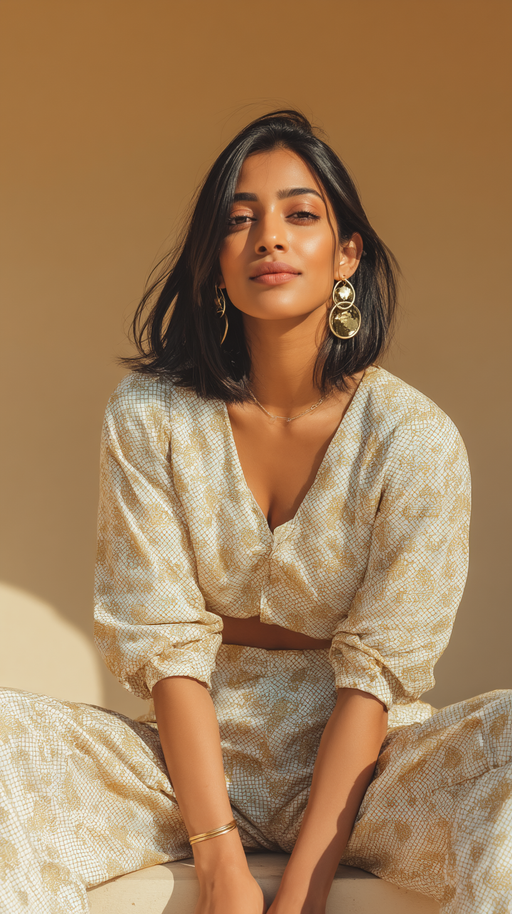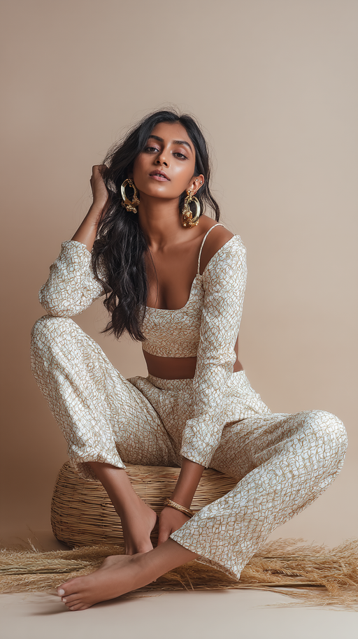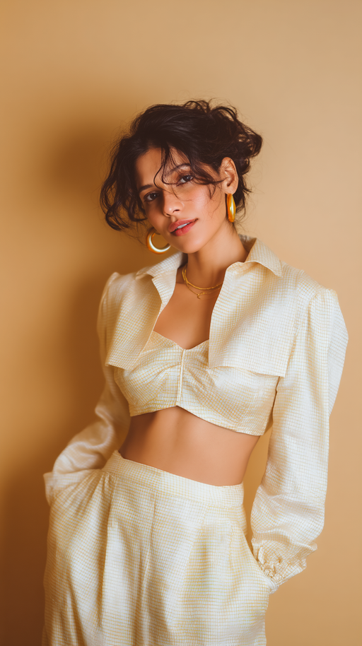 These beige-gold checked co-ords are crafted in a luxurious cotton blend with subtle shine. Designed for chic yet effortless looks. Try our digital...
