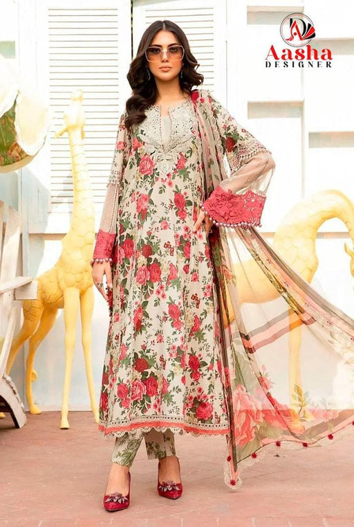View full detailsGrace meets glamour in this exquisite ivory floral ensemble from Aasha Designer. The soft ivory base is adorned with blooming red and pink roses, c...