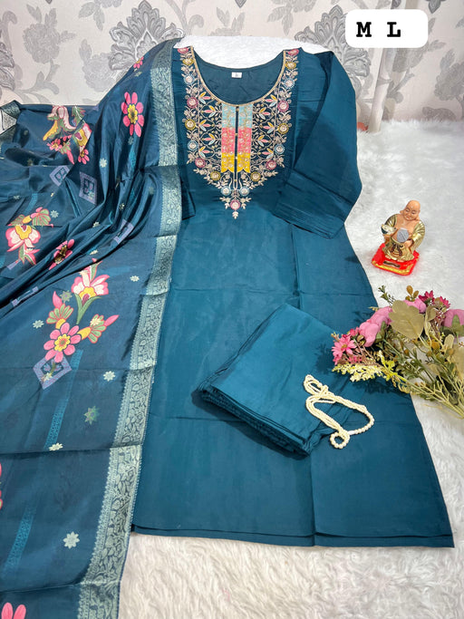 Embrace timeless grace with this Teal Embroidered Kurti Set, a perfect fusion of sophistication and heritage. The kurti features exquisite floral e...