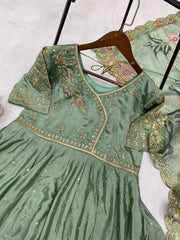 Olive Green Embroidered Anarkali Set with Digital Printed Dupatta