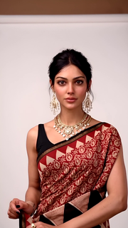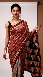 This maroon printed saree with bold black geometric triangle patterns on the pallu is a statement piece for women who love fusion of traditional prints and contemporary designs. The striped pleats paired with intricate motifs add balance, making it ideal for festivals, cultural events, and elegant gatherings.
