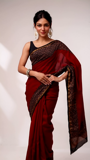 Enhance your ethnic elegance with this maroon and black cotton saree, beautifully designed with a solid maroon body and a contrasting floral block print pallu. The saree is accentuated with a black border detailed with golden piping, giving it a refined and graceful look. Perfect for both formal occasions and festive gatherings, this saree combines simplicity with sophistication.