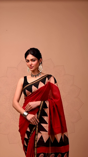 Step into bold elegance with this red and black cotton saree, beautifully highlighted with triangular geometric patterns and a striking paisley-printed pallu. The saree features a perfect contrast of solid red with traditional black, making it an exquisite pick for both festive occasions and cultural gatherings. Its golden border adds a regal touch, elevating the overall appeal.