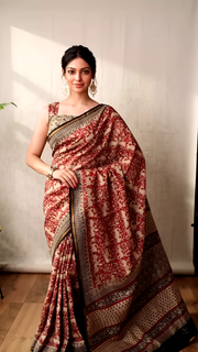 ๐ฟ Experience heritage craftsmanship with this Pure Hand Block Printed Chanderi Silk Saree, made using natural dyes for a sustainable and elegant finish. The saree showcases a rich maroon floral hand block print contrasted beautifully against a beige backdrop, with black borders and striped pallu accents that enhance its sophistication. Comes with a matching printed blouse piece to complete the look.