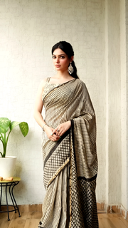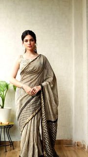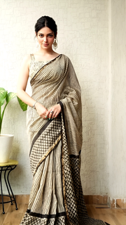Hand Block Cotton Saree โ Cream Stripes & Black Motifs