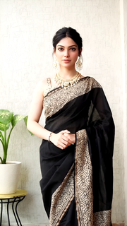 Pure Chanderi Silk Black Hand Block Saree โ€“ Beige Border