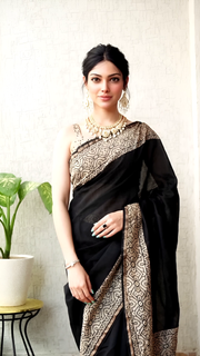 โœจ A classic piece of elegance, this Pure Chanderi Silk Saree comes in a rich black base highlighted with beige hand block printed borders and pallu. ๐ŸŒฟ Crafted using traditional block printing techniques, its natural sheen and feather-light drape make it both luxurious and comfortable. Complete with a matching printed blouse piece, this saree is a versatile choice for festive occasions, cultural gatherings, or elegant evenings.
