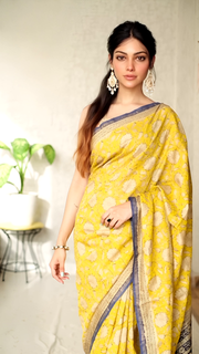 Pure Cotton Ajrakh Hand Block Printed Saree โ Mustard Yellow with Indigo Blue Border