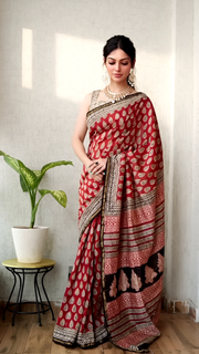 ✨ Add a touch of earthy elegance to your wardrobe with this Pure Cotton Ajrakh Saree, designed in a rich rust-red shade and adorned with off-white paisley block prints. 🌿 The borders feature classic black and beige leaf motifs, while the pallu stands out with traditional Ajrakh patterns and bold floral detailing—making it a statement piece of handcrafted heritage. Lightweight and breathable, it comes with a matching Ajrakh blouse piece, perfect for festive gatherings, cultural occasions, or office wear.