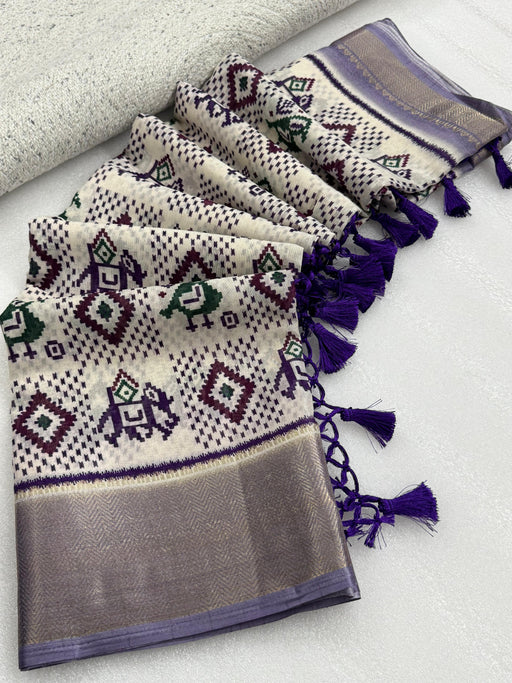 View full detailsCelebrate traditional artistry with this ivory ikat silk saree, showcasing exquisite woven motifs of elephants, birds, and geometric patterns in na...