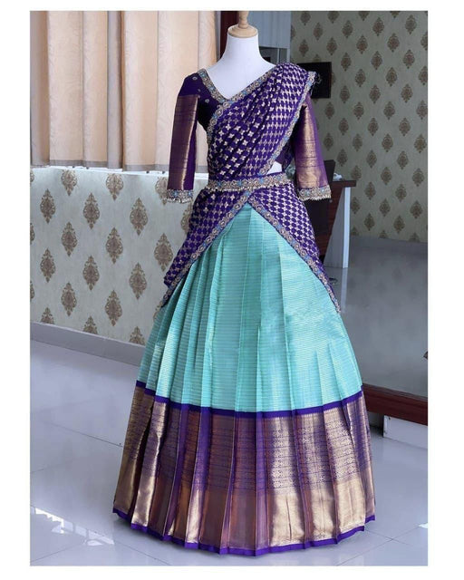 View full detailsStep into tradition with regal grace in this Royal Purple & Aqua Blue Kanjivaram Silk Half Saree, a masterpiece of South Indian craftsmanship a...