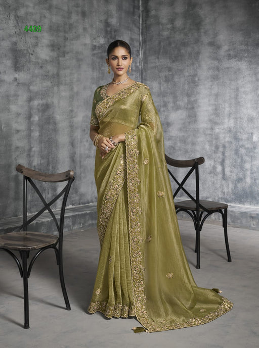 View full detailsStep into timeless elegance with this Olive Green Designer Saree, crafted in a shimmery silk-blend fabric that radiates sophistication. The saree i...