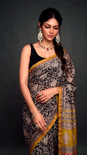 Style it with a black sleeveless blouse, oxidized silver jewelry, and loose waves or a bun for a graceful ethnic look.