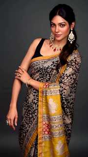 Drape yourself in earthy elegance with this black cotton saree, highlighted with intricate beige floral prints across the body. The saree is beautifully contrasted with a vibrant multicolor block print pallu featuring mustard, red, and cream tones, bordered with a mustard yellow edge for added richness. A versatile choice that balances subtle sophistication with festive vibrance.