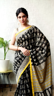 Black Maheshwari Silk Saree with Yellow Border