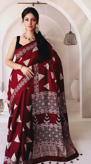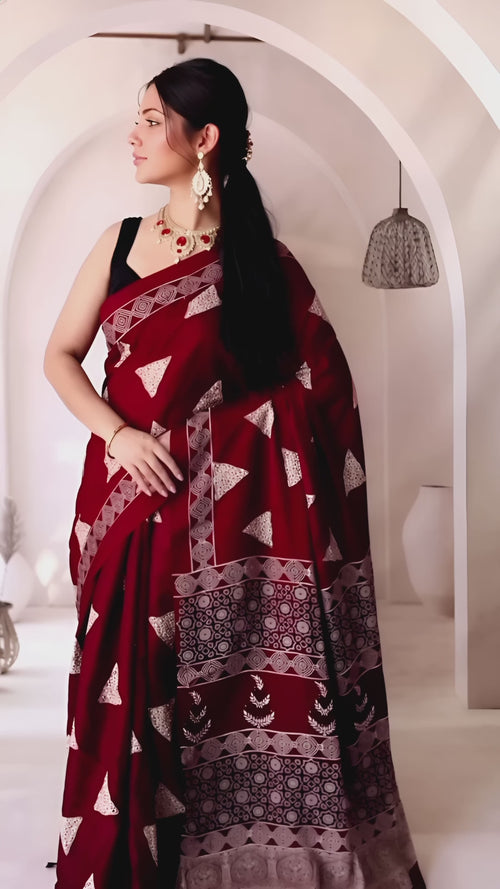 ✨ Elevate your ethnic wardrobe with this premium Pure Modal Silk Saree in a rich maroon base, hand block printed in authentic Ajrakh motifs. A luxurious sheen, soft drape, and attached tassels give it a royal finish. Comes with a 1m Ajrakh printed blouse piece. Perfect for festive occasions, weddings, or elegant evenings.